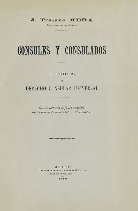 Trajano Mera, José. 1910. Cónsules y consulados : estudios de derecho consular universal. Madrid, España : Imprenta española, calle del Olivar, núm 8.