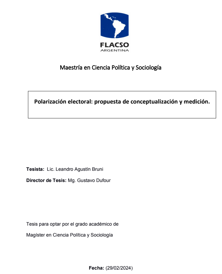 Bruni, Leandro Agustín (2024). Polarización electoral: propuesta de conceptualización y medición. Tesis de Maestría. FLACSO. Sede Académica Argentina, Buenos Aires.
