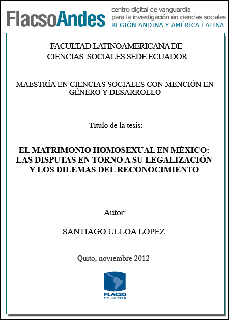 Ulloa López, Santiago (2012). El matrimonio homosexual en México : las disputas en torno a su legalización y los dilemas del reconocimiento. Maestría en Ciencias Sociales con mención en Género y Desarrollo, FLACSO Sede Ecuador. Quito, 129 p.