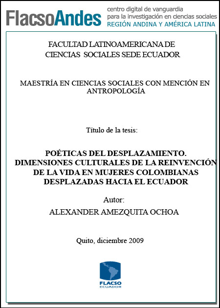 Amezquita Ochoa, Alexander (2009). Poéticas del desplazamiento. Dimensiones culturales de la reinvención de la vida en mujeres colombianas desplazadas hacia el Ecuador. Maestría en Ciencias Sociales con Mención en Antropología; FLACSO sede Ecuador. Quito. 98 p.
