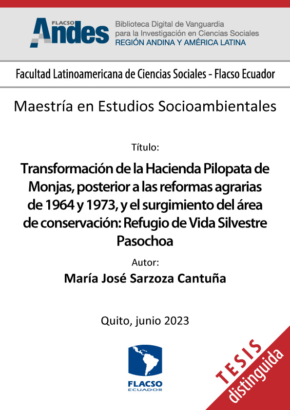Sarzoza Cantuña, María José. 2023. Transformación de la Hacienda Pilopata de Monjas, posterior a las reformas agrarias de 1964 y 1973, y el surgimiento del área de conservación: Refugio de Vida Silvestre Pasochoa. Tesis de maestría, Flacso Ecuador.