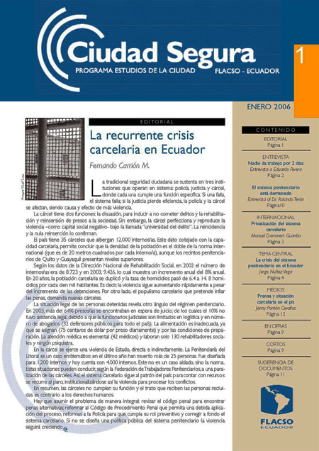 Ciudad segura. FLACSO sede Ecuador. Programa de Estudios de la Ciudad, Quito: FLACSO sede Ecuador, (n. 01, enero 2006): 12 p.