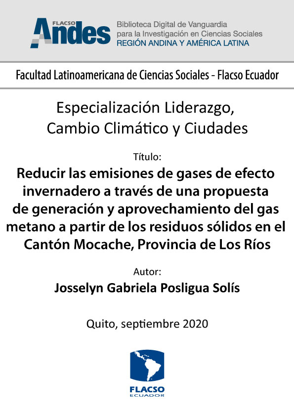Posligua Solís, Josselyn Gabriela. 2020. Reducir las emisiones de gases de efecto invernadero a través de una propuesta de generación y aprovechamiento del gas metano a partir de los residuos sólidos en el Cantón Mocache, Provincia de Los Ríos. Tesina de especialización, Flacso Ecuador.