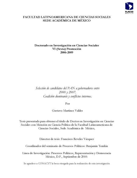 Martínez Valdes, Gustavo (2010). Selección de candidatos del PAN a gobernadores entre 2000 y 2007 : coalición dominante y conflictos internos. Doctorado de Investigación en Ciencias Sociales con Mención en Sociología; FLACSO México. México. 287 h.