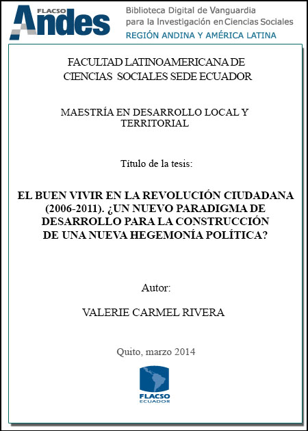 Carmel Rivera, Valerie. 2014. El buen vivir en la revolución ciudadana (2006-2011): ¿un nuevo paradigma de desarrollo para la construcción de una nueva hegemonía política?. Tesis de maestría, Flacso Ecuador.