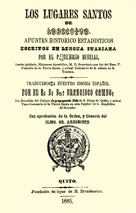 Buselli Remigio y Francisco Camps. 1885. Los lugares santos de Palestina : Apuntes historico estadísticos escritos en lengua italiana. Quito, Ecuador : Fundición de Tipos de M. Rivadeneira.