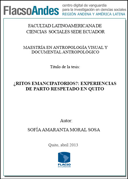 Moral, S. A. (2013). ¿Ritos emancipatorios?: experiencias de parto respetado en Quito (Tesis de Maestría en Antropología Visual y Documental Antropológico). FLACSO Sede Ecuador, Quito.