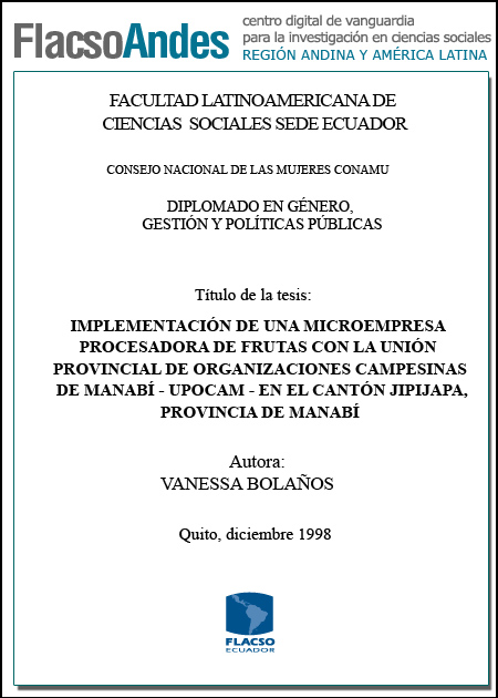 Bolaños, Vanessa (1998). Implementación de una microempresa procesadora de frutas con la Unión Provincial de Organizaciones Campesinas de Manabí – UPOCAM, en el cantón Jipijapa, provincia de Manabí. Diploma Superior Programa de Postgrado en Género, Gestión y Políticas Públicas; FLACSO sede Ecuador. Consejo Nacional de las Mujeres CONAMU. Quito. 25 p.