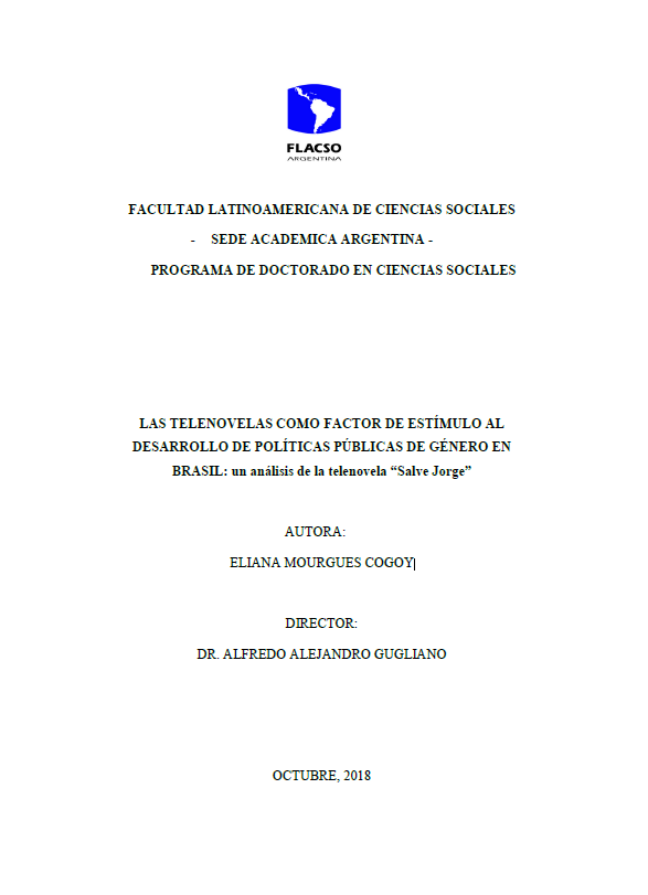 Mourgues Cogoy, Eliana. (2018). Las telenovelas como factor de estímulo al desarrollo de las políticas públicas de género en Brasil : un análisis de la telenovela “Salve Jorge”. Tesis de Doctorado. FLACSO. Sede Académica Argentina, Buenos Aires.