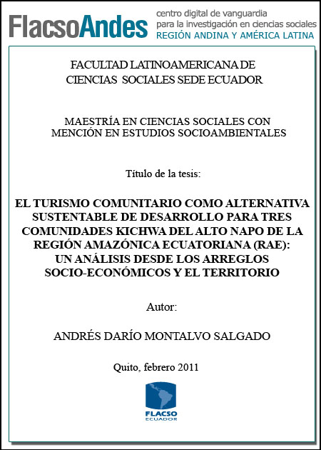 Montalvo Salgado, Andrés Darío (2011). El turismo comunitario como alternativa sustentable de desarrollo para tres comunidades kichwa del Alto Napo de la Región Amazónica Ecuatoriana (RAE) : un análisis desde los arreglos socio-económicos y el territorio. Maestría en Ciencias Sociales con mención en Estudios Socioambientales; FLACSO - Sede Ecuador. Quito. 148 p.