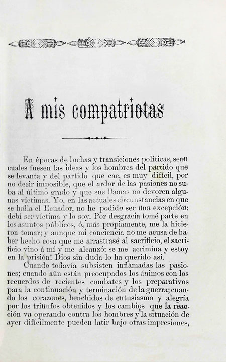 En épocas de luchas y transiciones políticas, sean cuales fuesen las ideas y los hombres del partido que se levanta y del partido que cae, es muy difícil, por no decir imposible, que el ardor de las pasiones no suba al último grado y que sus llamas no devoren algunas víctimas. Yo, en las actuales circunstancias en que se halla el Ecuador, no he podido ser una excepción: debí ser víctima y lo soy. Por desgracia tomé parte en los asuntos públicos, ó, más propiamente, me la hicieron tomar; y aunque mi conciencia no me acusa de haber hecho cosa que me arrastrasé al sacrificio, el sacrificio vino á mí y me alcanzó: se me acrimina y estoy en la prisión! Dios sin duda lo ha querido así.