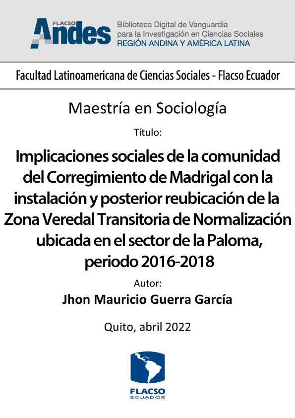 Guerra García, Jhon Mauricio. 2022. Implicaciones sociales de la comunidad del Corregimiento de Madrigal con la instalación y posterior reubicación de la Zona Veredal Transitoria de Normalización ubicada en el sector de la Paloma, periodo 2016-2018. Tesis de maestría, Flacso Ecuador.