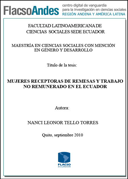 Tello Torres, Nanci Leonor (2010). Mujeres receptoras de remesas y trabajo no remunerado en el Ecuador. Maestría en Ciencias Sociales con mención en Género y Desarrollo; FLACSO Sede Ecuador. Quito. 86 p.