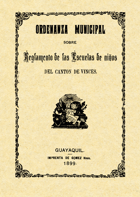 Ecuador. Concejo Municipal de Vinces. Ordenanza Municipal sobre Reglamento de las Escuelas de niños del cantón de Vinces. Quito, Ecuador : Imprenta de Gomez Hnos.