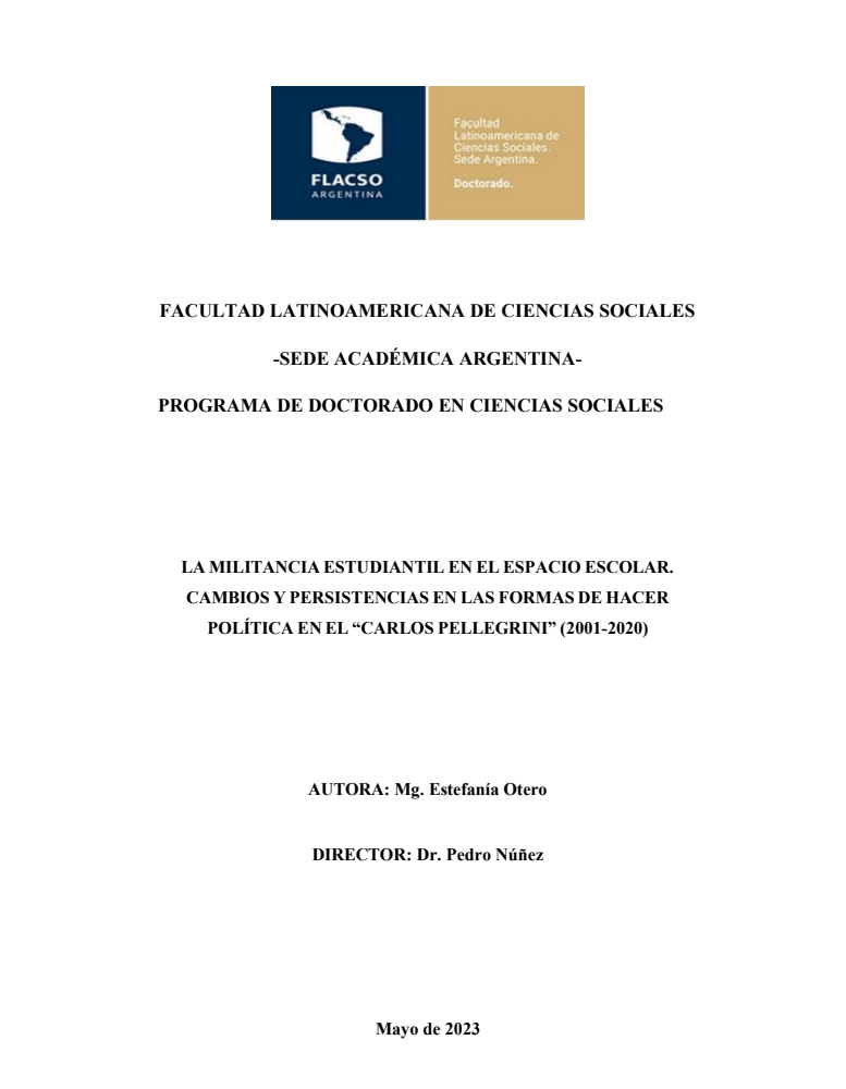 Otero, Estefanía Soledad (2023). La militancia estudiantil en el espacio escolar: cambios y persistencias en las formas de hacer política en el " Carlos Pellegrini " (2001-2020). Tesis de Doctorado. FLACSO. Sede Académica Argentina, Buenos Aires.