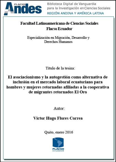 Flores Correa, Víctor Hugo. 2016. El asociacionismo y la autogestión como alternativa de inclusión en el mercado laboral ecuatoriano para hombres y mujeres retornadas afiliadas a la cooperativa de migrantes retornados El Oro. Tesina de especialización, Flacso Ecuador.