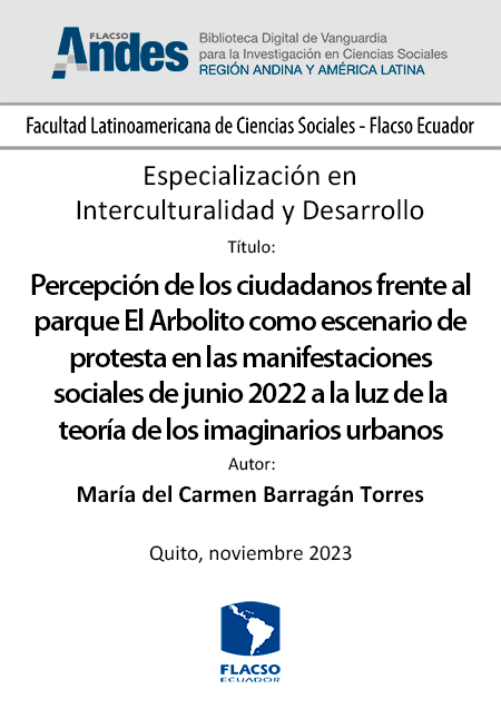 Barragán Torres, María del Carmen. 2023. Percepción de los ciudadanos frente al parque El Arbolito como escenario de protesta en las manifestaciones sociales de junio 2022 a la luz de la teoría de los imaginarios urbanos. Tesina de especialización, Flacso Ecuador.
