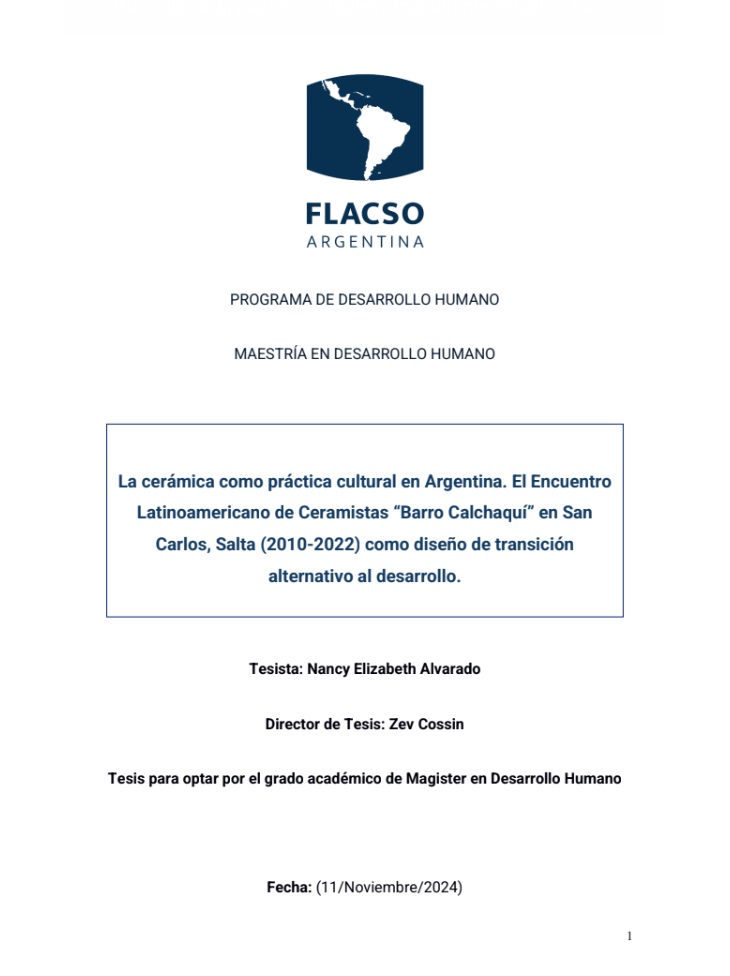 Alvarado, Nancy Elizabeth (2024). La cerámica como práctica cultural en Argentina: el Encuentro Latinoamericano de Ceramistas “Barro Calchaquí” en San Carlos, Salta (2010-2022) como diseño de transición alternativo al desarrollo. Tesis de Maestría. FLACSO. Sede Académica Argentina, Buenos Aires.
