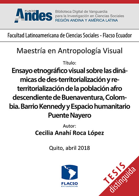Roca López, Cecilia Anahí. 2018. Ensayo etnográfico visual sobre las dinámicas de des-territorialización y re-territorialización de la población afrodescendiente de Buenaventura, Colombia. Barrio Kennedy y Espacio Humanitario Puente Nayero. Tesis de maestría, Flacso Ecuador.