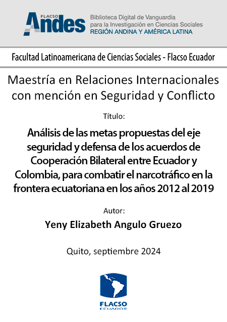 Angulo Gruezo, Yeny Elizabeth. 2024. Análisis de las metas propuestas del eje seguridad y defensa de los acuerdos de Cooperación Bilateral entre Ecuador y Colombia, para combatir el narcotráfico en la frontera ecuatoriana en los años 2012 al 2019. Tesis de maestría, Flacso Ecuador.