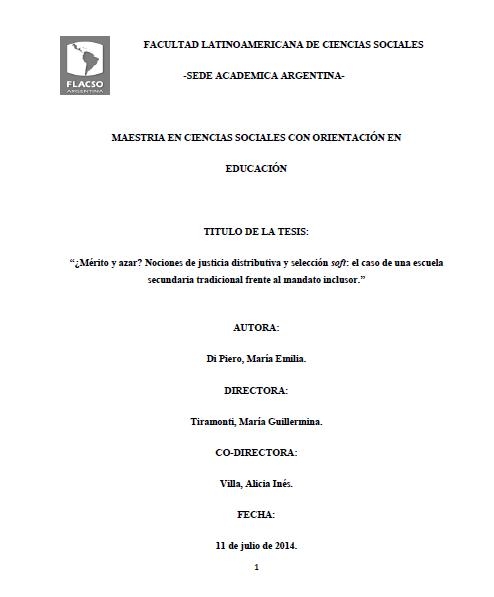 Di Piero, María Emilia (2014). ¿Mérito y azar? : nociones de justicia distributiva y selección soft. El caso de una escuela secundaria tradicional frente al mandato inclusor. Tesis de Maestría. FLACSO. Sede Académica Argentina, Buenos Aires.