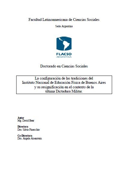 Beer, David (2014). La configuración de las tradiciones del Instituto Nacional de Educación Física de Buenos Aires y su resignificación en el contexto de la última dictadura militar. Tesis de doctorado. FLACSO. Sede Académica Argentina, Buenos Aires.