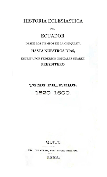González Suárez, Federico. 1881. Historia eclesiástica del Ecuador desde los tiempos de la conquista hasta nuestros días: 1520-1600. Quito, Ecuador : Imprenta del Clero, por Isidoro Miranda.