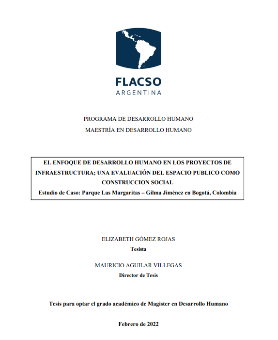 Gómez Rojas, Elizabeth (2022). El enfoque de desarrollo humano en los proyectos de infraestructura : una evaluación del espacio público como construcción social. Estudio de caso: Parque Las Margaritas – Gilma Jiménez en Bogotá, Colombia. Tesis de Maestría. FLACSO. Sede Académica Argentina, Buenos Aires.