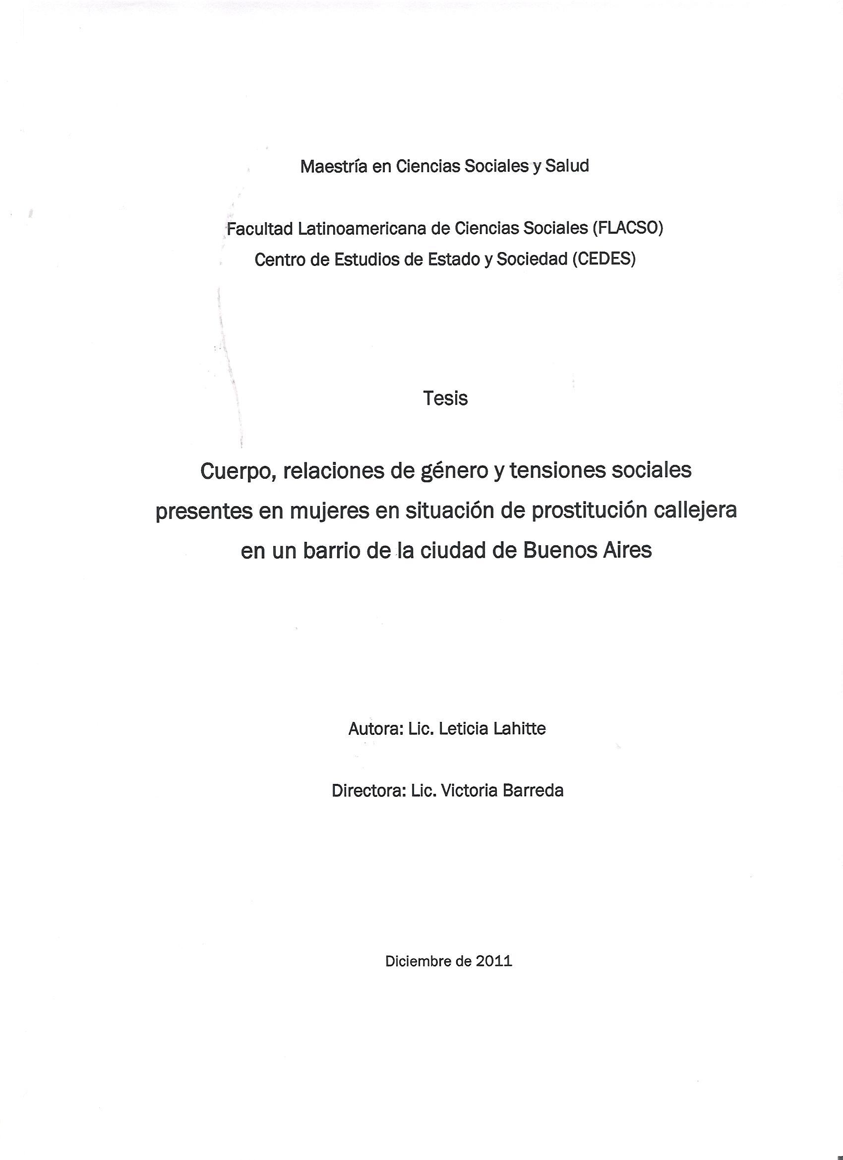 Lahitte, Leticia (2012). Cuerpo, relaciones de género y tensiones sociales presentes en mujeres de situación de prostitución callejera en un barrio de la ciudad de Buenos Aires. Tesis de Maestría. FLACSO. Sede Académica Argentina, Centro de Estudios de Estado y Sociedad, Buenos Aires.