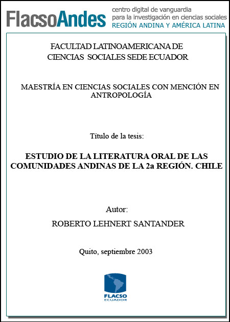 Lehnert Santander, Roberto (2003). Estudio de la literatura oral de las comunidades andinas de la 2a. Región. Chile. Maestría en Ciencias Sociales con mención en Antropología e Historia. FLACSO, Sede Ecuador : Colegio Andino. Centro de Estudios Regionales Andinos Bartolomé de las. [s.l.]. 114 p.