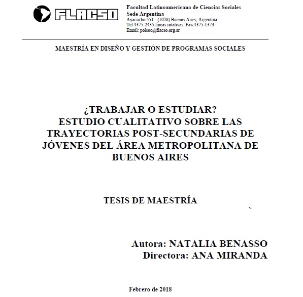 Benasso, Natalia (2018). ¿Trabajar o estudiar? : estudio cualitativo sobre las trayectorias post-secundarias de jóvenes de área metropolitana de Buenos Aires. FLACSO. Sede Académica Argentina, Buenos Aires.