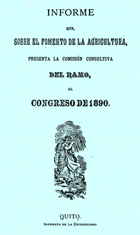 Sodiro, Luis. [1890]. Informe que, sobre el fomento de la agricultura, presenta la Comisión Consultiva del Ramo, al Congreso de 1890. Quito, Ecuador : Imprenta de la Universidad.