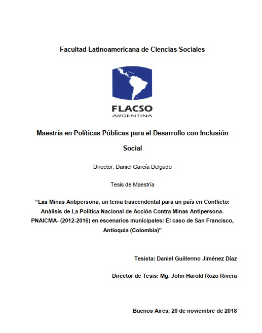 Jiménez Díaz, Daniel Guillermo (2019). Las minas antipersona : un tema trascendental para un país en conflicto: análisis de la Política Nacional de Acción Contra Minas Antipersona PNAICMA ( 2012 - 2016 ) en escenarios municipales. El caso de San Francisco, Antioquia (Colombia). Tesis de Maestría. FLACSO. Sede Académica Argentina, Buenos Aires.