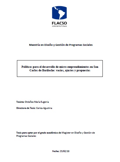 Ordoñez, María Eugenia (2018). Políticas para el desarrollo de micro emprendimientos en San Carlos de Bariloche : vacíos, ajustes y propuestas. Tesis de Maestría. FLACSO. Sede Académica Argentina, Buenos Aires.