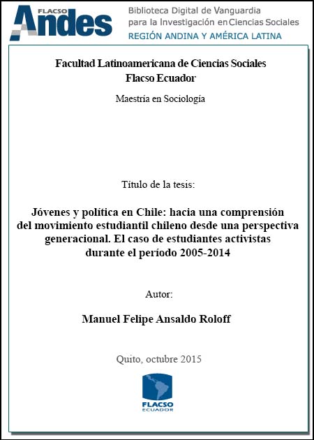 Ansaldo Roloff, Manuel Felipe. 2015. Jóvenes y política en Chile: hacia una comprensión del movimiento estudiantil chileno desde una perspectiva generacional. El caso de estudiantes activistas durante el período 2005-2014. Tesis de maestría, Flacso Ecuador.