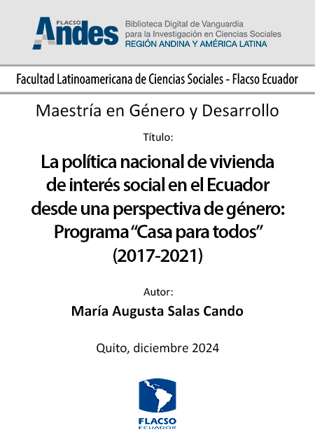 Salas Cando, María Augusta. 2024. La política nacional de vivienda de interés social en el Ecuador desde una perspectiva de género: Programa “Casa para todos” (2017-2021). Tesis de maestría, Flacso Ecuador.