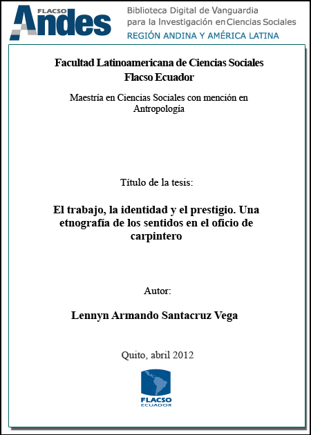 Santacruz Vega, Lennyn Armando. 2012. El trabajo y la identidad y el prestigio. Una etnografía de los sentidos en el oficio de carpintero. Tesis de maestría, Flacso Ecuador.