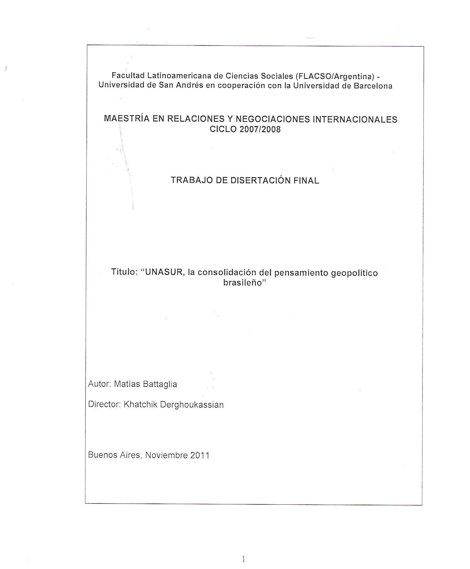 Battaglia, Matías (2012). UNASUR, la consolidación del pensamiento geopolítico brasileño. Tesis de Maestría. FLACSO. Sede Académica Argentina, Universidad de San Andrés, Universitat de Barcelona, Buenos Aires.