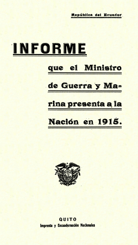 Ministerio de Guerra y Marina. 1915. Informe que el Ministro de Guerra y Marina presenta a la Nación en 1915. Quito, Ecuador : Imprenta y Encuadernación Nacionales.