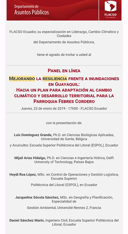 La Facultad Latinoamericana de Ciencias Sociales (FLACSO Ecuador) y el Centro de Investigación para el Desarrollo Internacional (IDRC-CRDI) tiene el agrado de invitar a usted al Coloquio Mejorando la resiliencia frente a inundaciones en Guayaquil: Hacia un plan para adaptación al cambio climático y desarrollo territorial para la Parroquia Febres Cordero: “Análisis de vulnerabilidad y percepción social frente a inundaciones en Guayaquil”, Organizado por Ariana Bravo, estudiante de la ELCCC como parte de su proyecto de vinculación con la sociedad. 23 de enero de 2020.