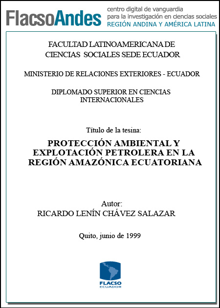 Chávez Salazar, Ricardo Lenin (1999). Protección ambiental y explotación petrolera en la Región Amazónica Ecuatoriana. Diplomado Superior en Ciencias Internacionales; FLACSO - Sede Ecuador. Quito. 61 p.