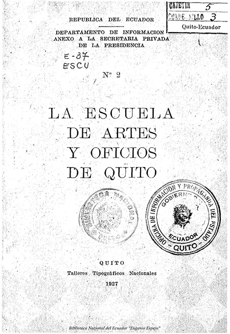 Escuela de Artes y Oficios. 1927. La Escuela de Artes y Oficios de Quito. Quito : Talleres Tipográficos Nacionales.
