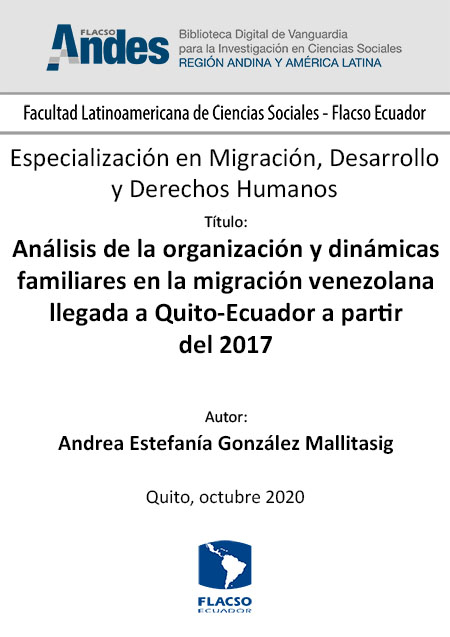 González Mallitasig, Andrea Estefanía. 2020. Análisis de la organización y dinámicas familiares en la migración venezolana llegada a Quito-Ecuador a partir del 2017. Tesina de especialización, Flacso Ecuador.