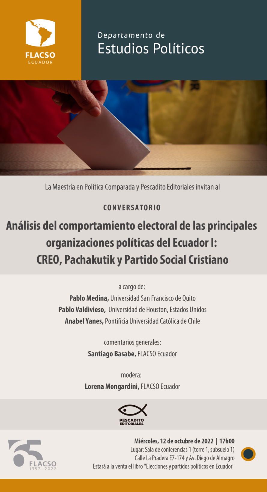 FLACSO Ecuador : Estudios Políticos – Conversatorio Análisis del comportamiento electoral de las principales organizaciones políticas del Ecuador I: CREO, Pachakutik y Partido Social Cristiano, 12 de octubre de 2022 - 17:00 – 18:30 - FLACSO Ecuador, Quito. Un evento organizado por la Maestría en Política Comparada y Pescadito Editoriales con la moderación de Lorena Mongardini (FLACSO Ecuador).