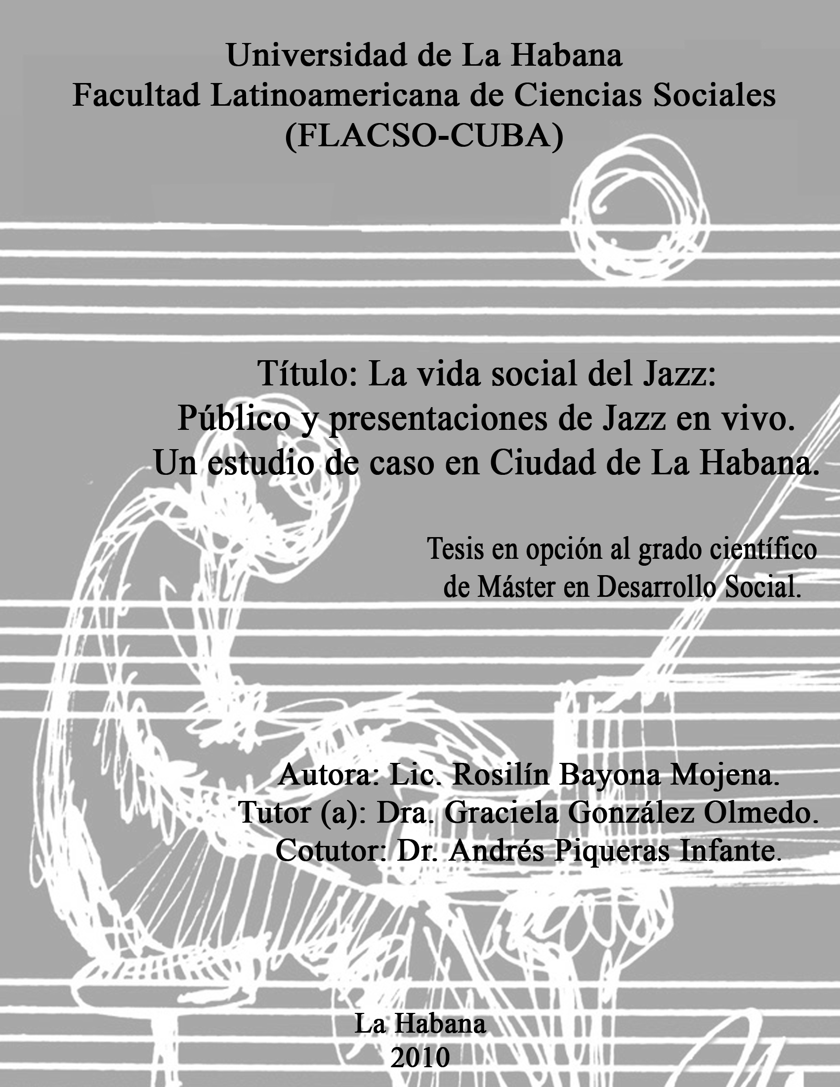 Bayona Mojena, Rosilín (2010). La vida social del Jazz: público y presentaciones de Jazz en vivo. Un estudio de caso en Ciudad de La Habana. Maestría en Desarrollo Social, FLACSO Programa Cuba. 126 p.