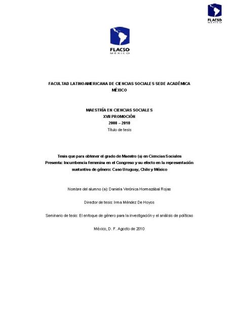Hormazábal Rojas, Daniela Verónica (2010). Incumbencia femenina en el Congreso y su efecto en la representación sustantiva de género : caso Uruguay, Chile y México. Maestría en Ciencias Sociales; FLACSO México. México. 131 h.