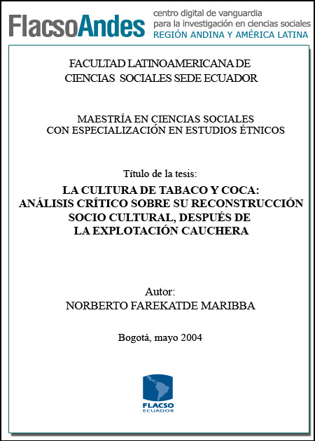 Farekatde Maribba, Norberto (2004). La cultura del tabaco y coca : análisis crítico sobre su reconstrucción socio-cultural, después de la explotación cauchera. Maestría en Ciencias Sociales con Especialización en Estudios Étnicos, FLACSO Sede Ecuador. Quito. 151 p.