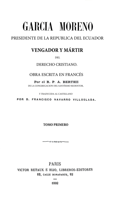 Berthe, R. P. A. 1892. García Moreno presidente de la República del Ecuador, vengador y mártir del derecho cristiano. Traducida al castellano por D. Francisco Navarro Villoslada. Paris, Francia: Victor Retaux e Hijo, Libreros – Editores.
