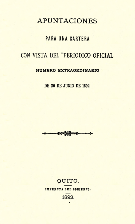 1892. Apuntaciones para una cartera con vista del "Periódico Oficial" número extraordinario de 30 de junio de 1892. Quito, Ecuador : Imprenta del Gobierno.