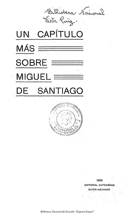 Puig, Víctor .1933. Un capítulo más sobre Miguel de Santiago. Quito : Editorial Gutenberg.